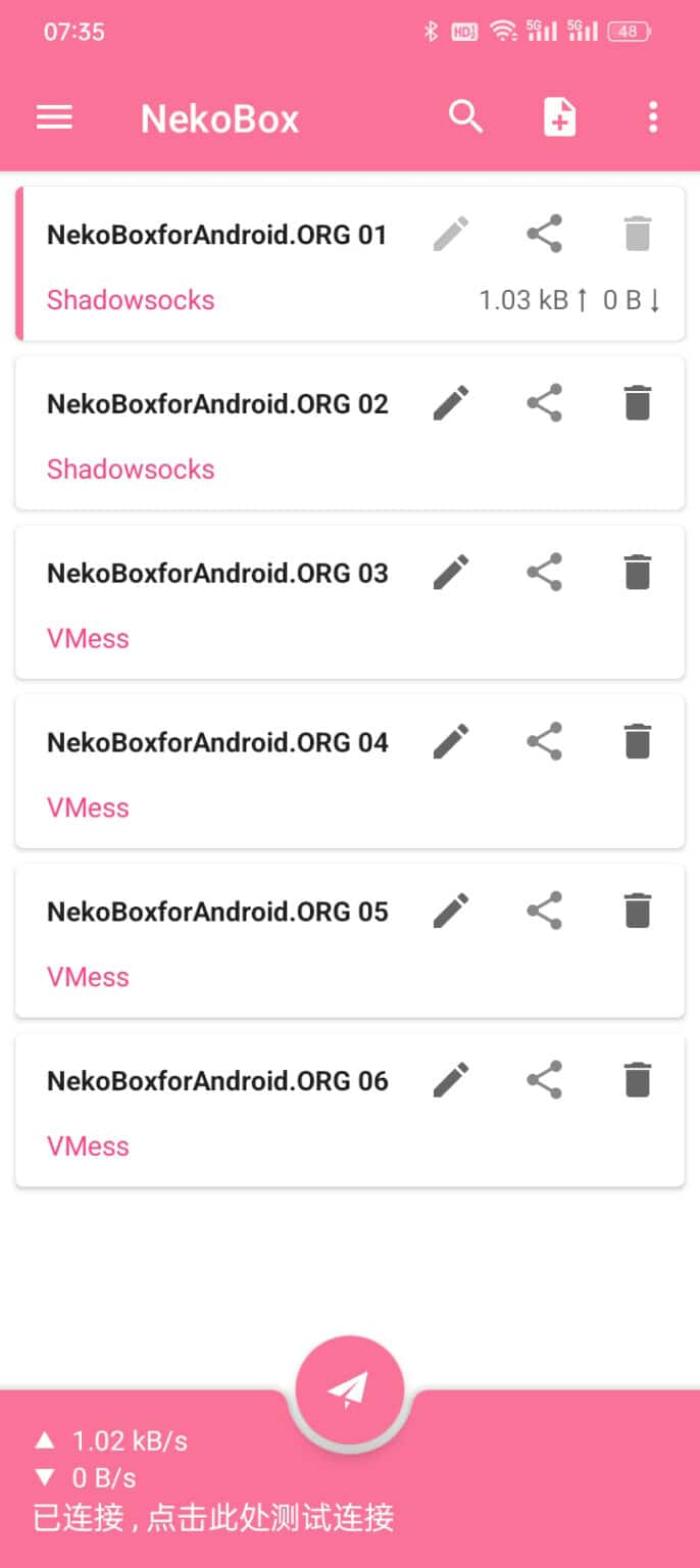 随后回到软件的主界面,可以看到刚刚新增的节点订阅地址,选择任意一个节点,点击软件主界面最底部的按钮进行服务器连接,在弹出的对话框 允许"NekoBox"创建 VPN 连接吗?点击允许即可,如下图所示: