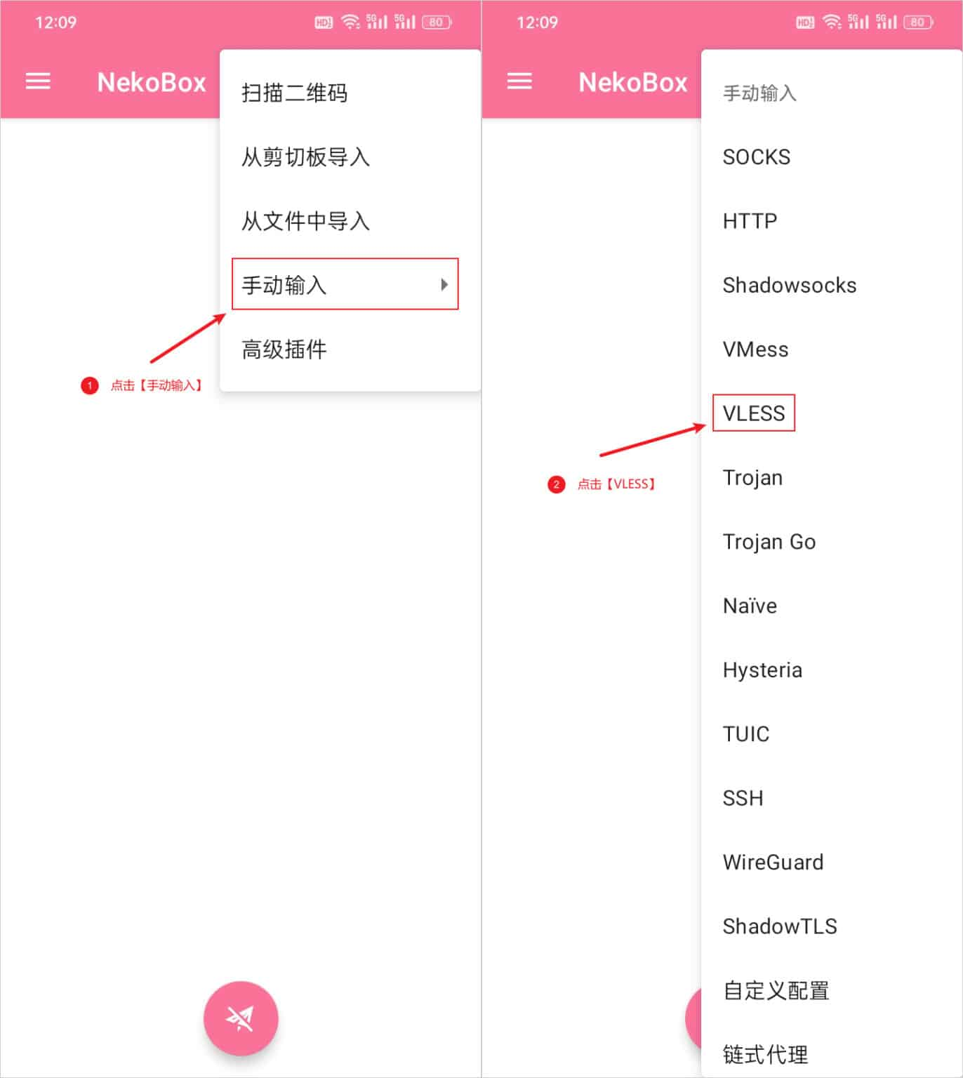 配置 VLESS 服务器节点,通过点击软件主界面右上角的 ➕ 号按钮即可出现添加配置文件选项,选择手动输入,随后在弹出的窗口中选择 VLESS 选项,如下图所示: