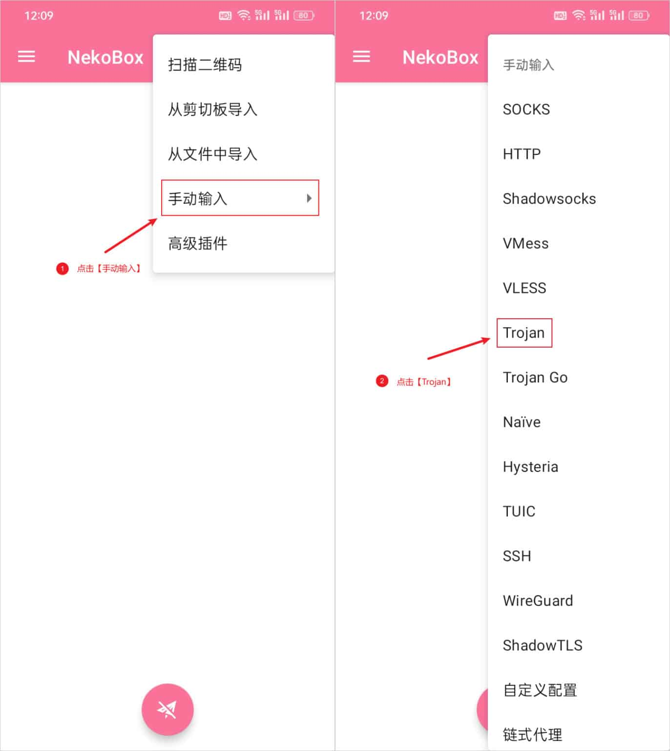 配置 Trojan 服务器节点,通过点击软件主界面右上角的 ➕ 号按钮即可出现添加配置文件选项,选择手动输入,随后在弹出的窗口中选择 Trojan 选项,如下图所示: