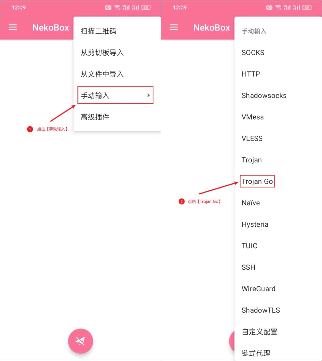 配置 Trojan Go 服务器节点,通过点击软件主界面右上角的 ➕ 号按钮即可出现添加配置文件选项,选择手动输入,随后在弹出的窗口中选择 Trojan Go 选项,如下图所示: