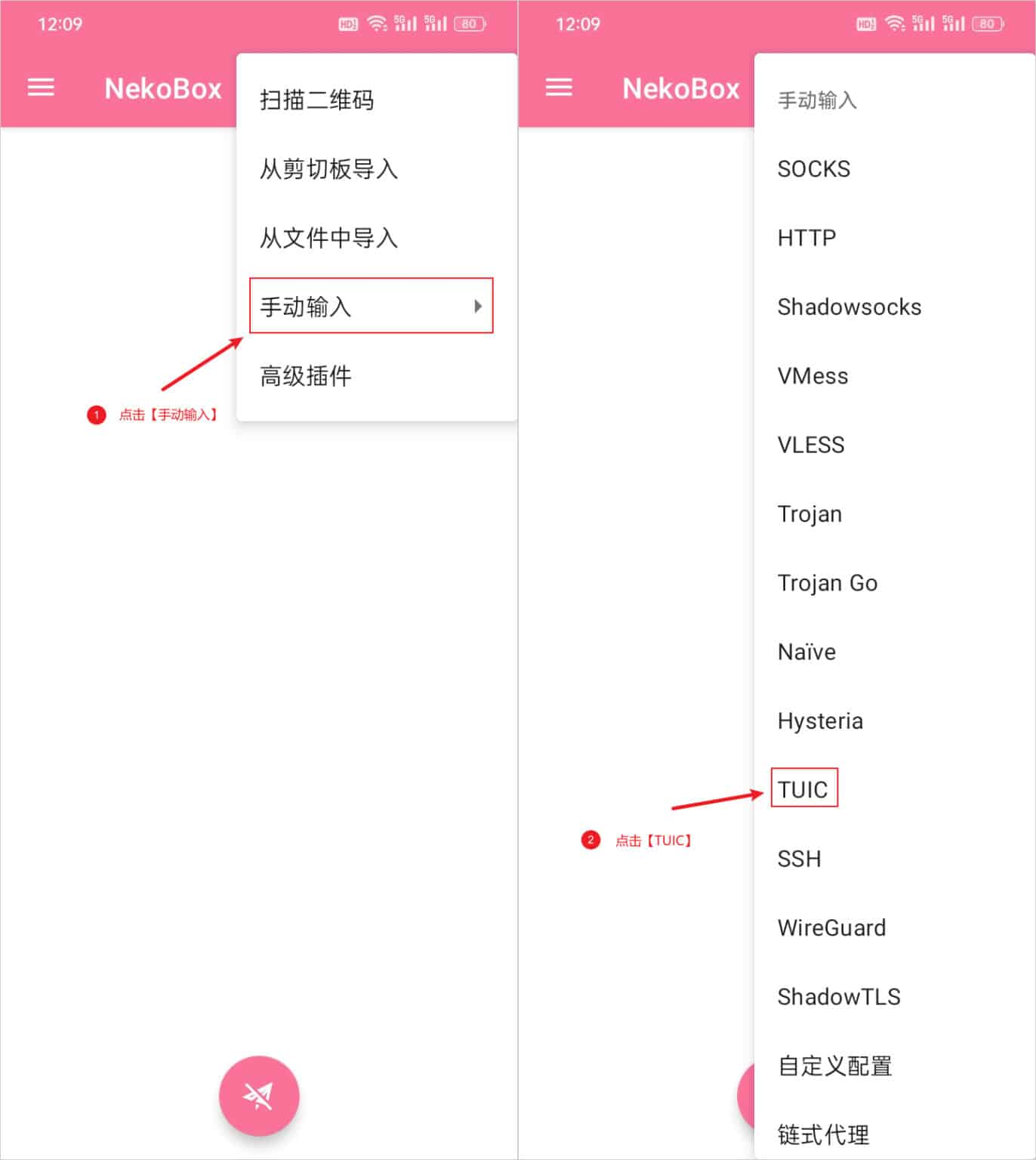配置 TUIC 服务器节点,通过点击软件主界面右上角的 ➕ 号按钮即可出现添加配置文件选项,选择手动输入,随后在弹出的窗口中选择 TUIC 选项,如下图所示: