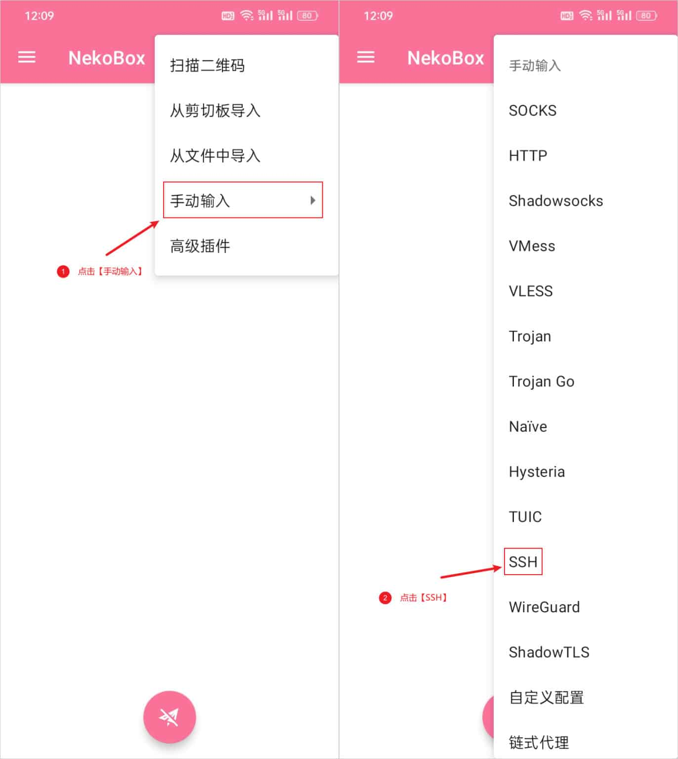 配置 SSH 服务器节点,通过点击软件主界面右上角的 ➕ 号按钮即可出现添加配置文件选项,选择手动输入,随后在弹出的窗口中选择 SSH 选项,如下图所示: