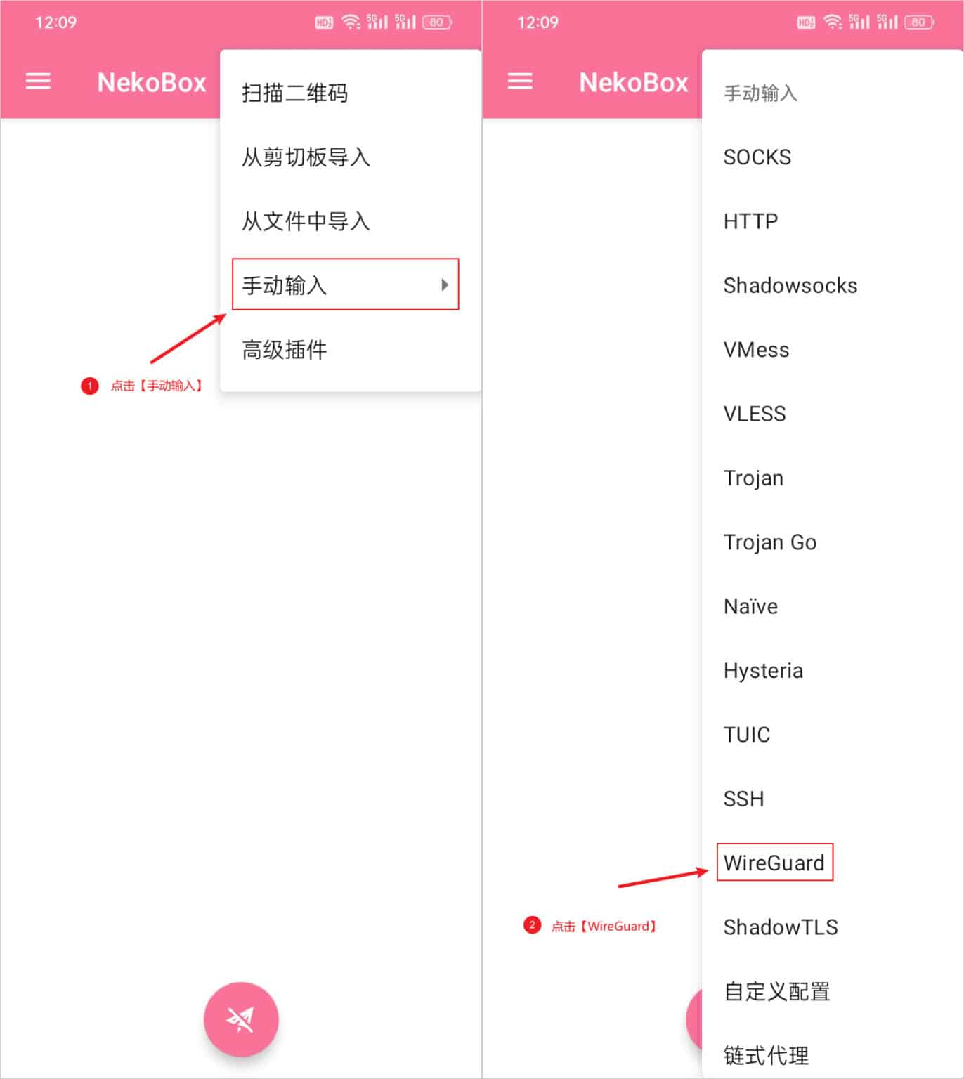 配置 WireGuard 服务器节点,通过点击软件主界面右上角的 ➕ 号按钮即可出现添加配置文件选项,选择手动输入,随后在弹出的窗口中选择 WireGuard 选项,如下图所示: