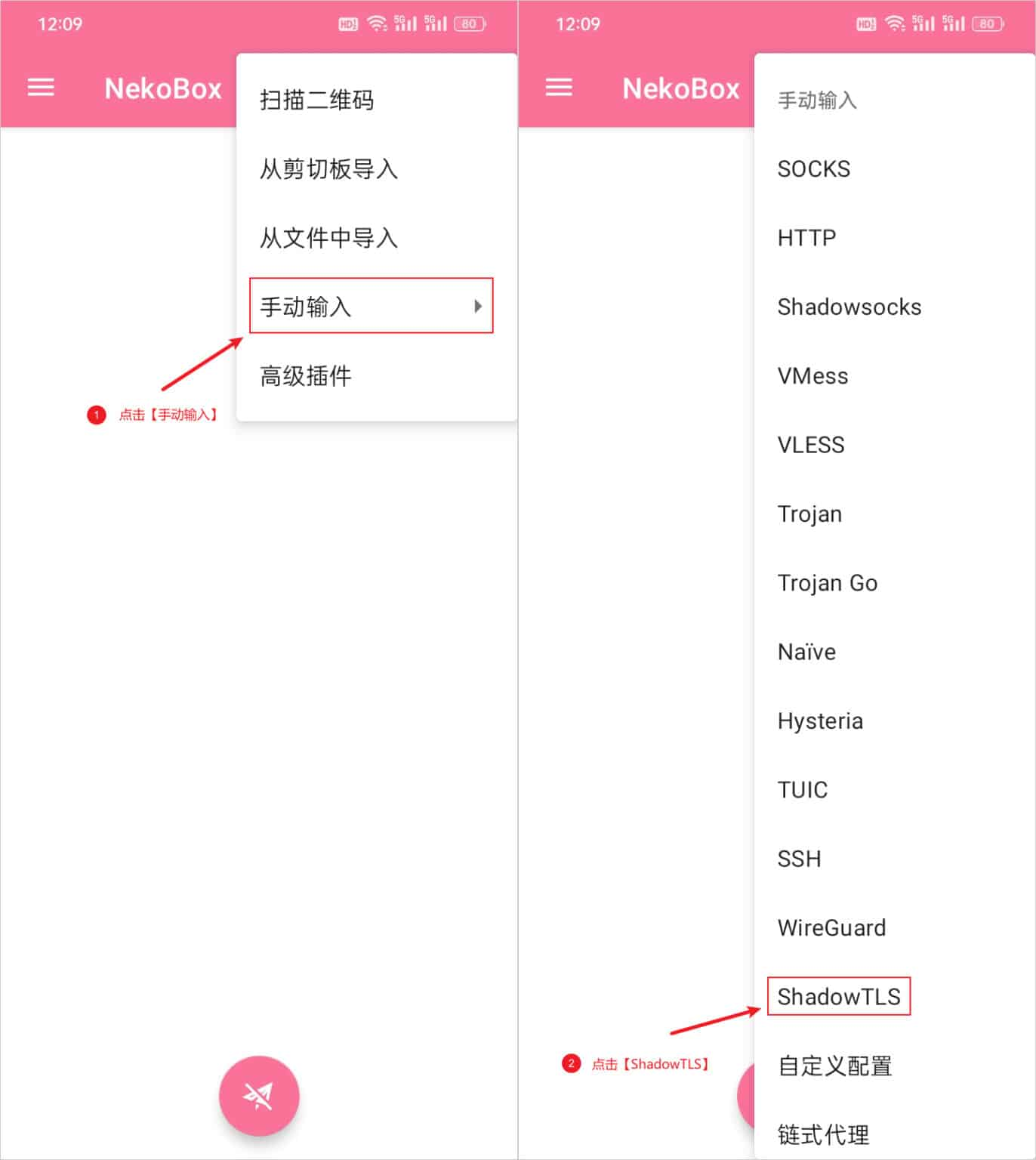 配置 ShadowTLS 服务器节点,通过点击软件主界面右上角的 ➕ 号按钮即可出现添加配置文件选项,选择手动输入,随后在弹出的窗口中选择 ShadowTLS 选项,如下图所示: