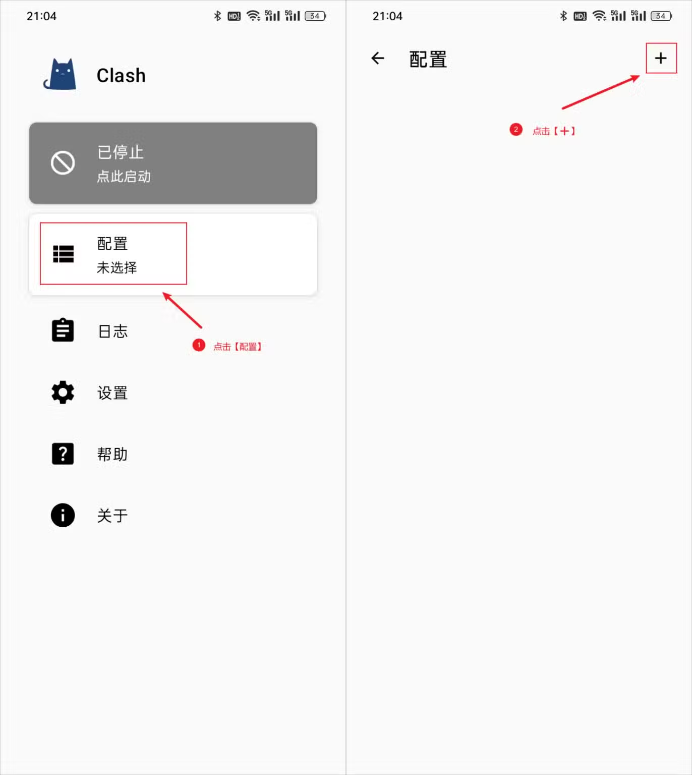 打开 Clash for Android,首次进入主界面后点击右上角 ➕ 添加配置。