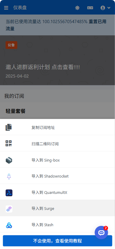在 红岸云仪表盘 向下滑动,找到 一键订阅 ,点击「导入到 Surge」