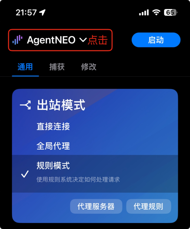 在首页点击右上角的 启动 或 停止 按钮即可切换 VPN 状态。