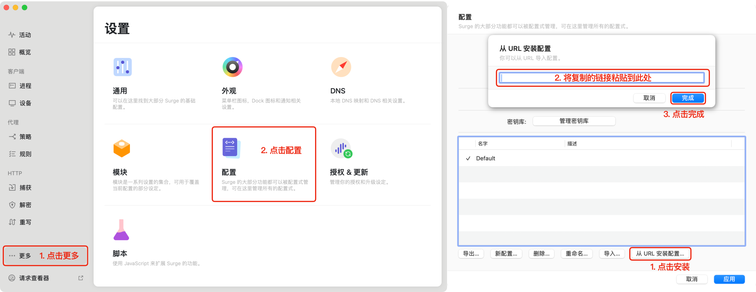 - 打开 Surge,点击左侧「更多」 > 「配置」